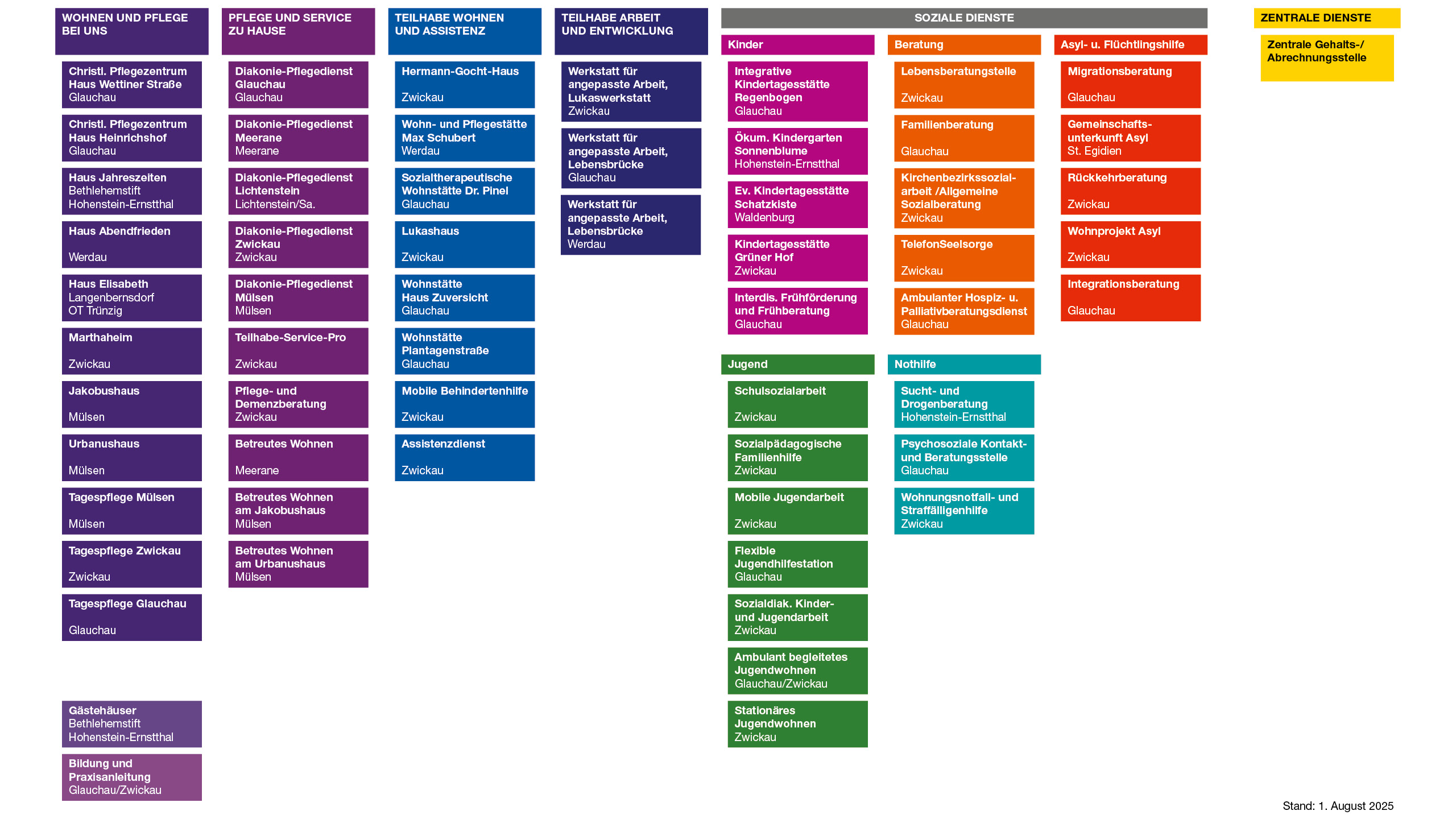 Wir sind mit 60 Einrichtungen im Landkreis Zwickau vertreten und bieten ein breites Spektrum an Angeboten in den Bereichen Pflege, Teilhabe für Menschen mit Behinderung und Soziale Dienste an.